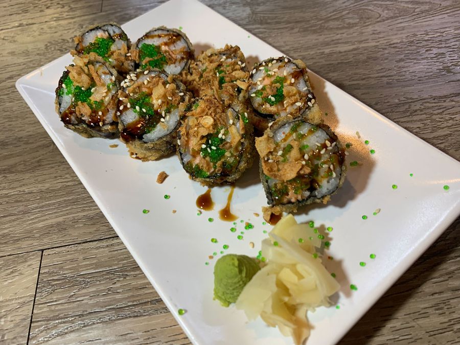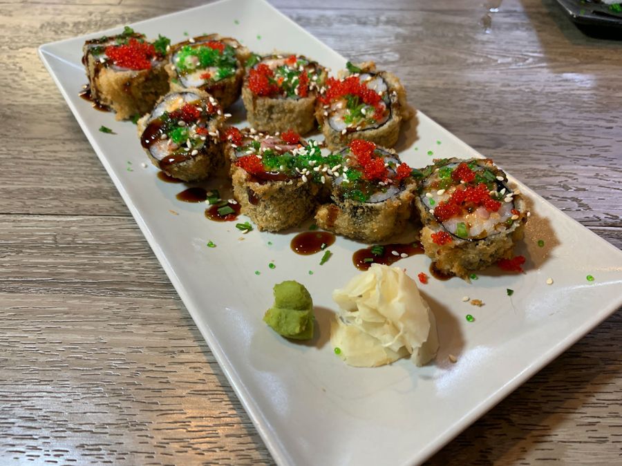 Τηγανητό χέλι, καβουροσαλάτα, σκόνη κρεμμυδιου, σουσάμι