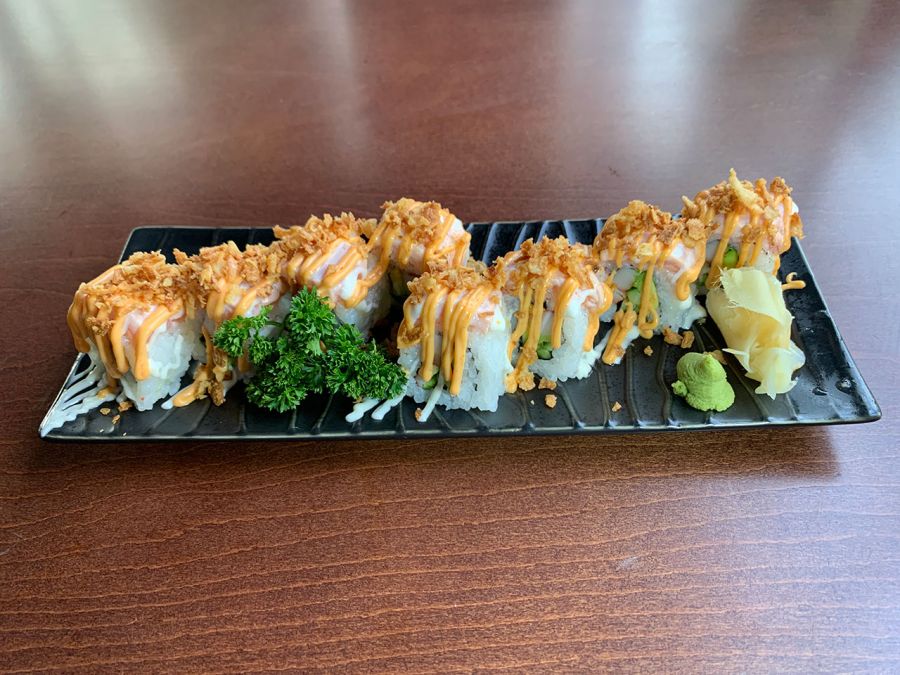 Σολωμός, αβοκάντο, αγγούρι, τσίλι σως, σκόνη κρεμμυδιού, σως καβουριού