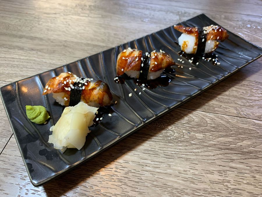 Φρέσκια γαρίδα, ψητό χέλι, αβοκάντο, σως χελιού