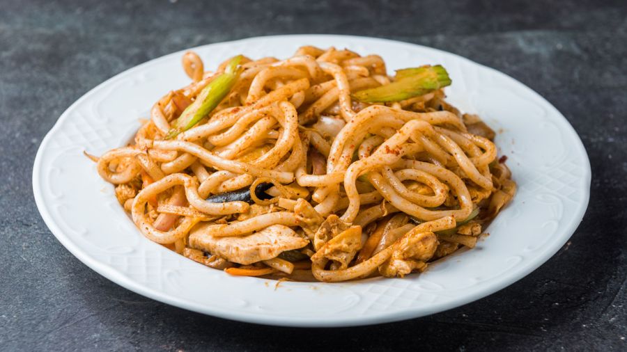 udon noodles με κοτόπουλο, καρότο, μανιτάρια, λάχανο, celery, κρεμμύδι, satay