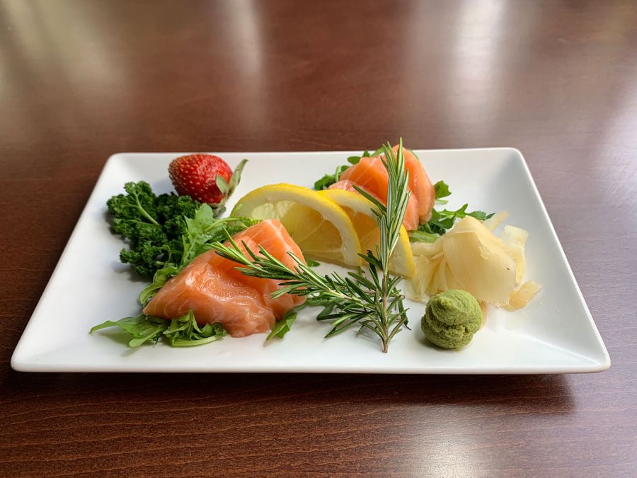 Τηγανητός σολωμός, σως χελιού, σκονη κρεμμυδιού, καβουροσαλάτα, σουσάμι